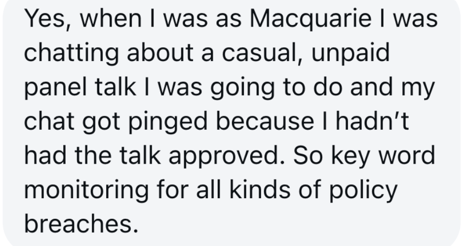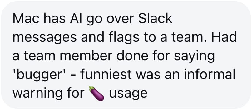 Some do. Regulated industries like banking and insurance run keyword monitoring that flags language automatically. At Macquarie, staff have been cautioned on more than one occasion for language used in what they thought were private Teams and Slack messages between colleagues. One person got flagged for calling someone a moron in Slack. At one general insurer, any bad language in chat triggered an automatic flag and repeat offences went straight to management.
