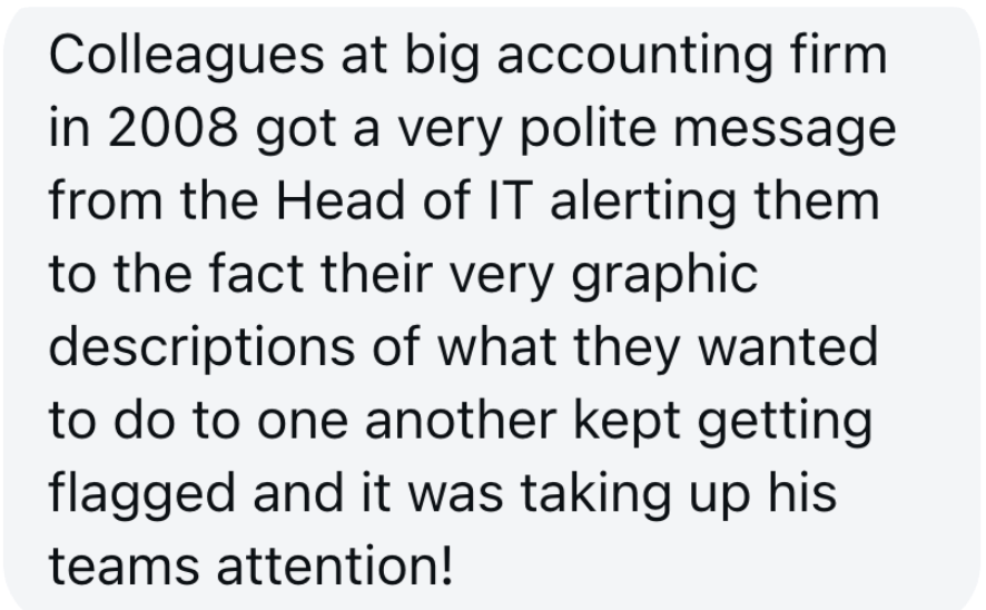 It's not just swearing. Slack messages have been cited as the reason someone was deemed a "poor cultural fit" and dismissed at the end of probation. One person got pulled up for sending a movie quote GIF, and the two people they'd sent it to were also spoken to for not reporting the "misconduct and poor online behaviour." Even companies that don't actively monitor still have full access when they need it. If you're ever under investigation for anything, HR and IT can pull your entire chat history across every platform, and an ex-HR professional confirmed that reviewing messages was a standard part of their role. People have lost their jobs over it.